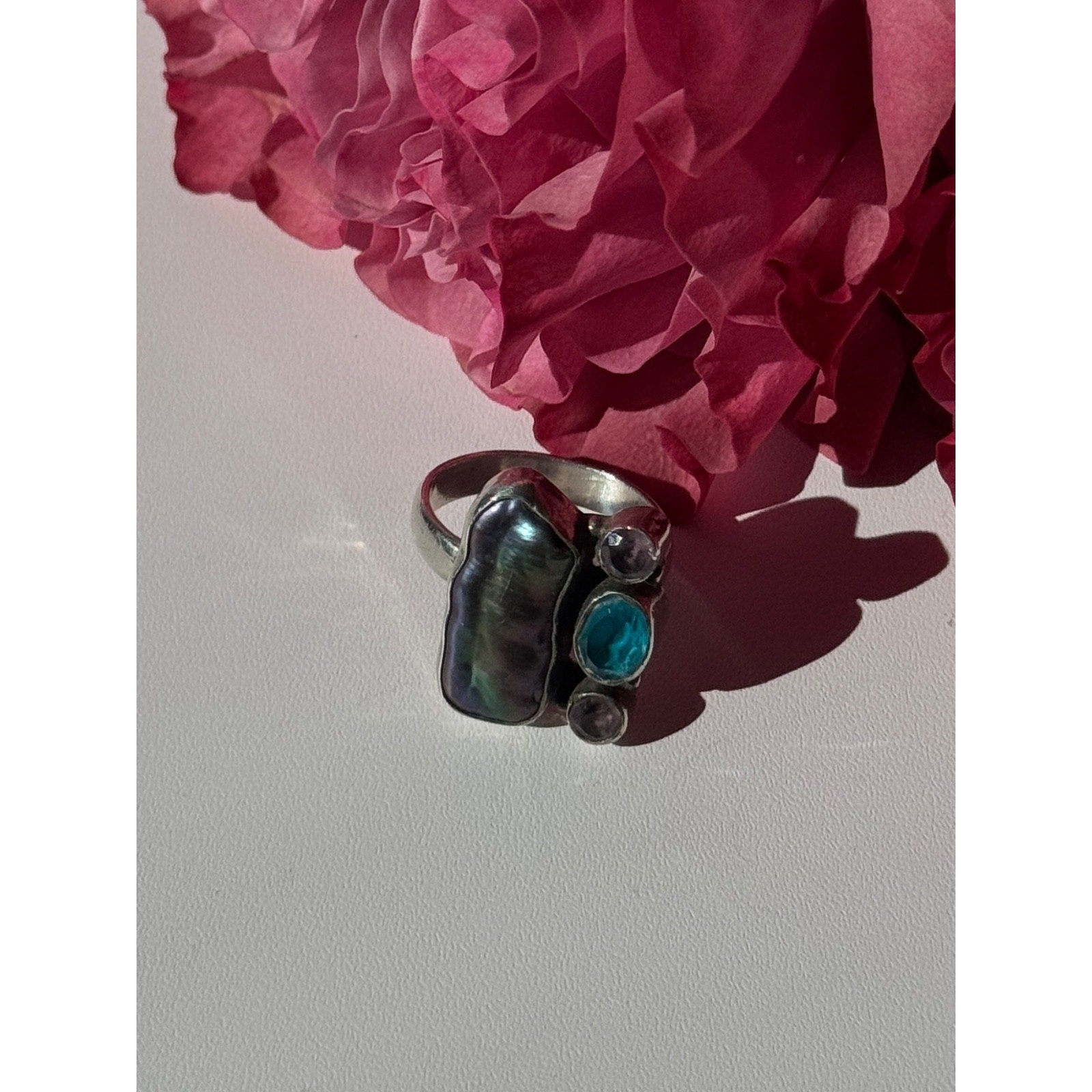 925 Sterling Silver Abalone Amethyst Aquamarine Ring Size 6