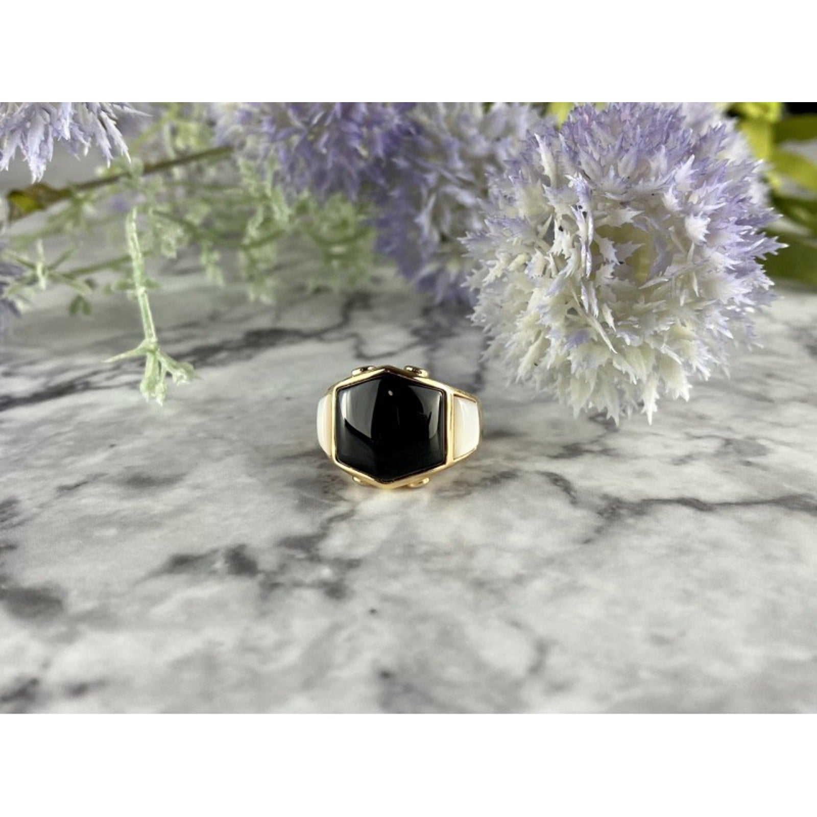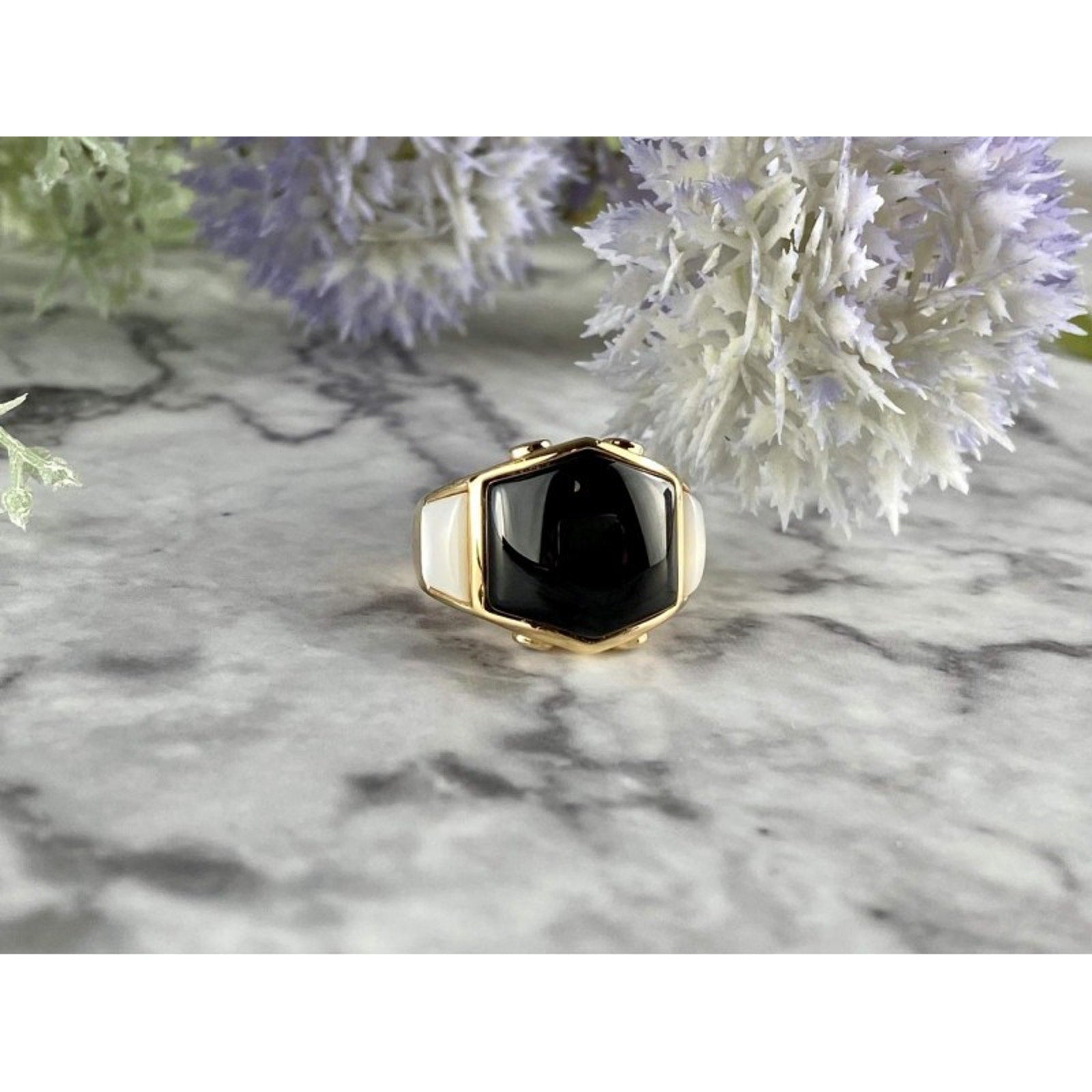 925 STERLING SILVER GOLD PLATED BLACK JADE, MOTHER OF PEARL & CZ RING SIZE 7
