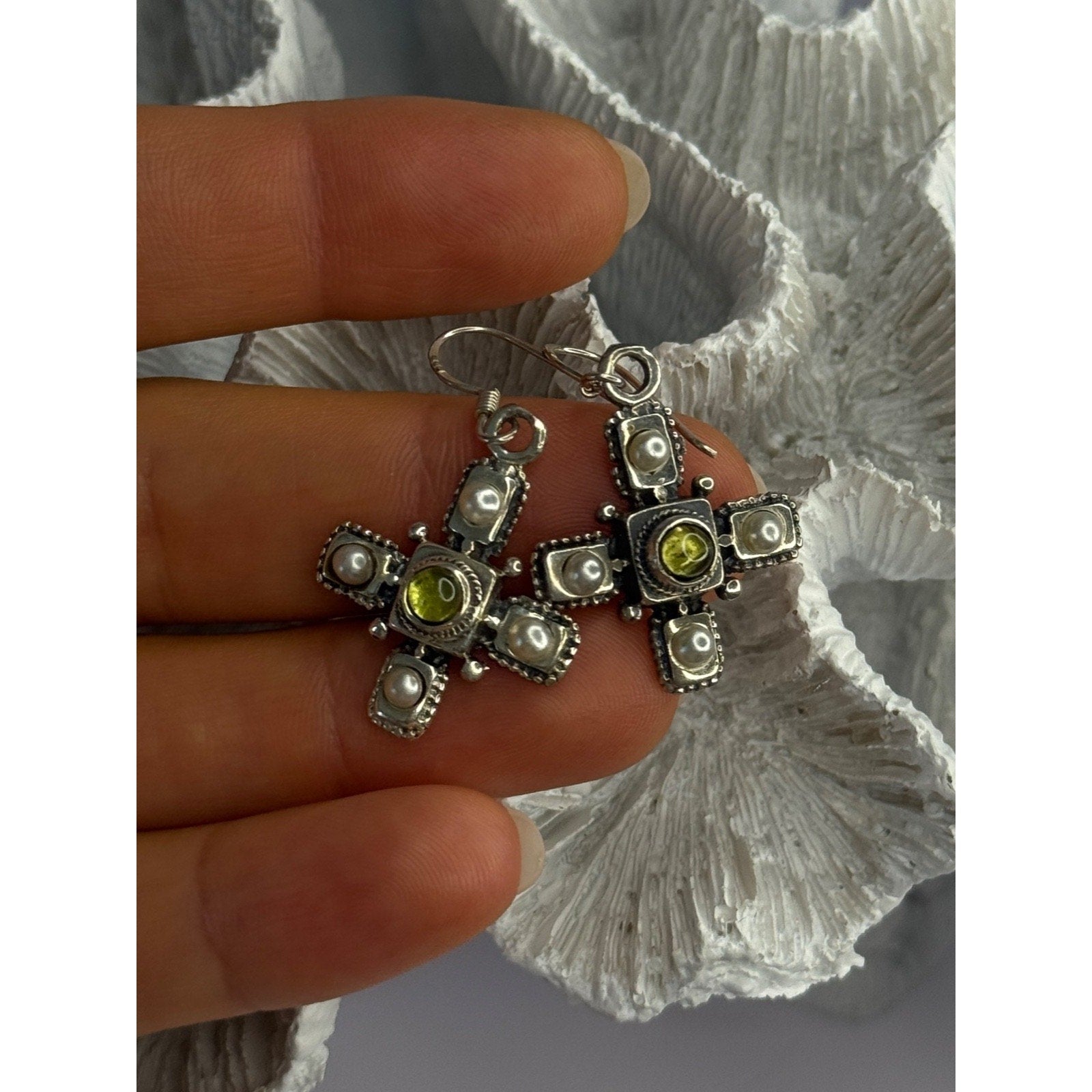 925 STERLING SILVER GREEN AMBER & PEARL CROSS EARRINGS LENGTH 1.50 INCH