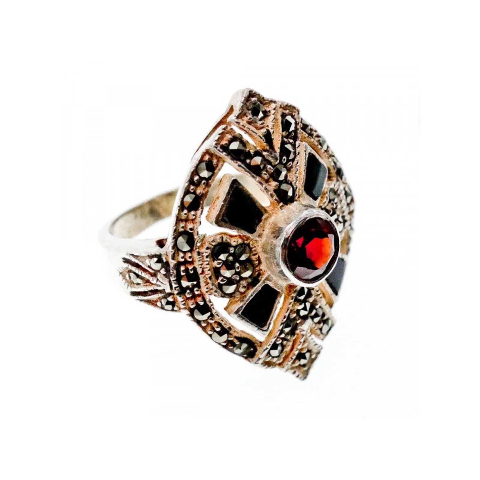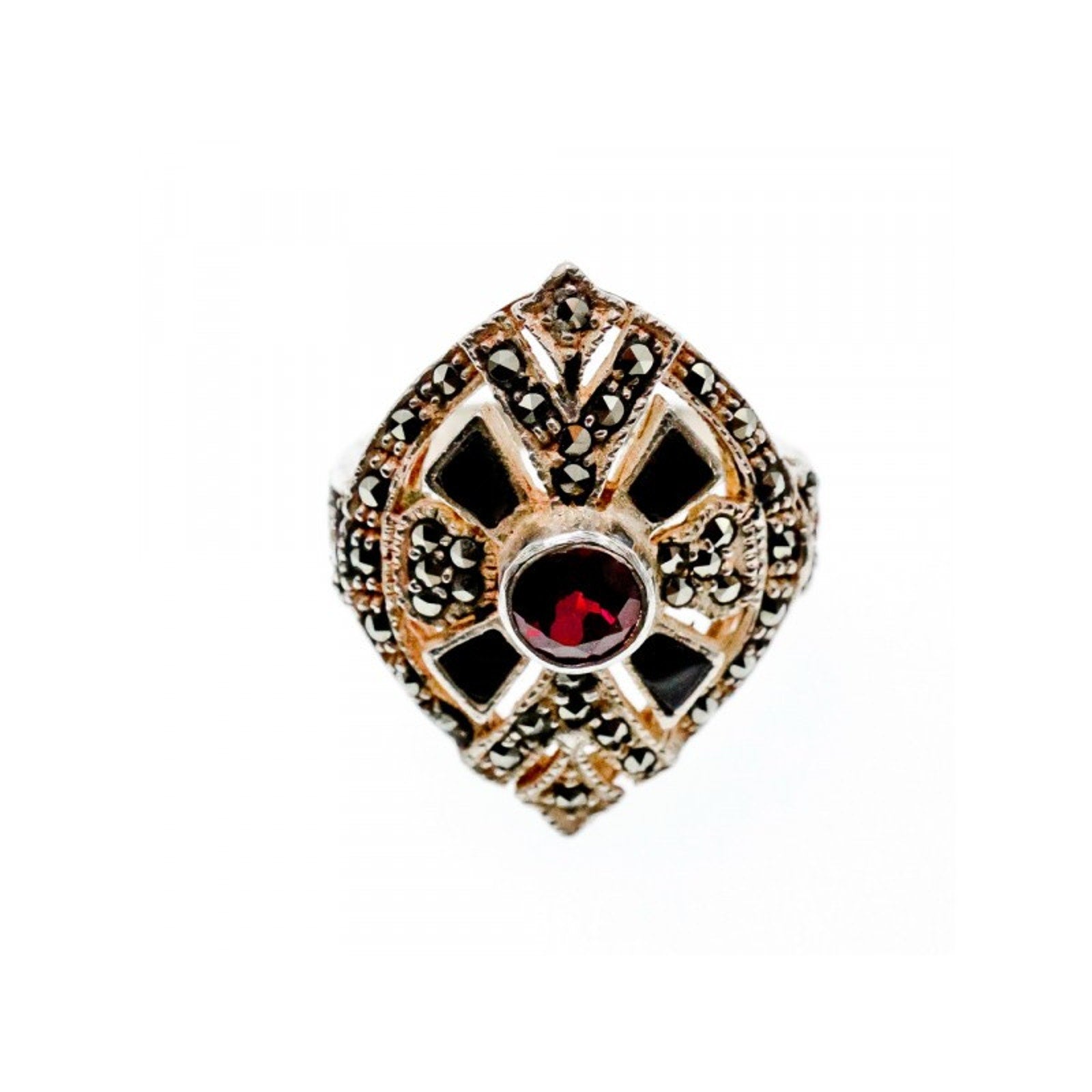 925 STERLING SILVER SPESSARTINE, BLACK NEPHRITE & MARCASITES RING SIZE 6.5