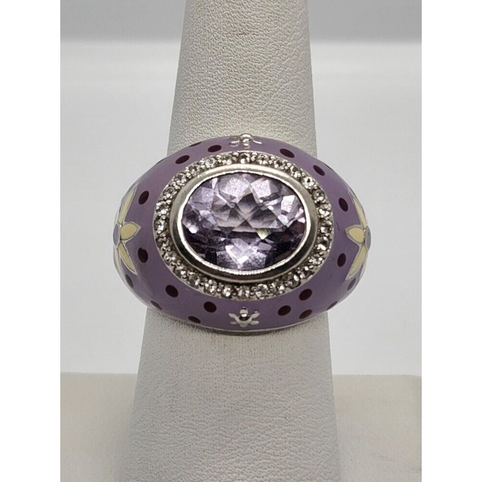 925 STERLING SILVER WITH AMETHYST & QUARTZ ON ENAMEL RING SIZE 7.5