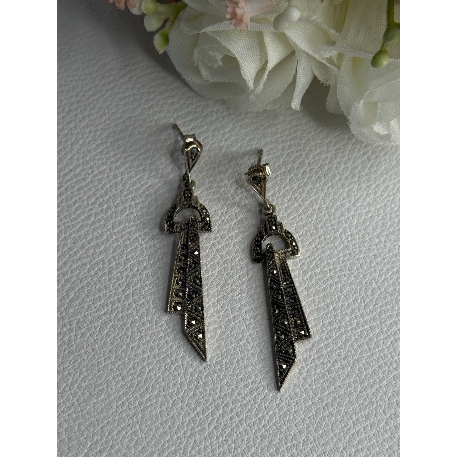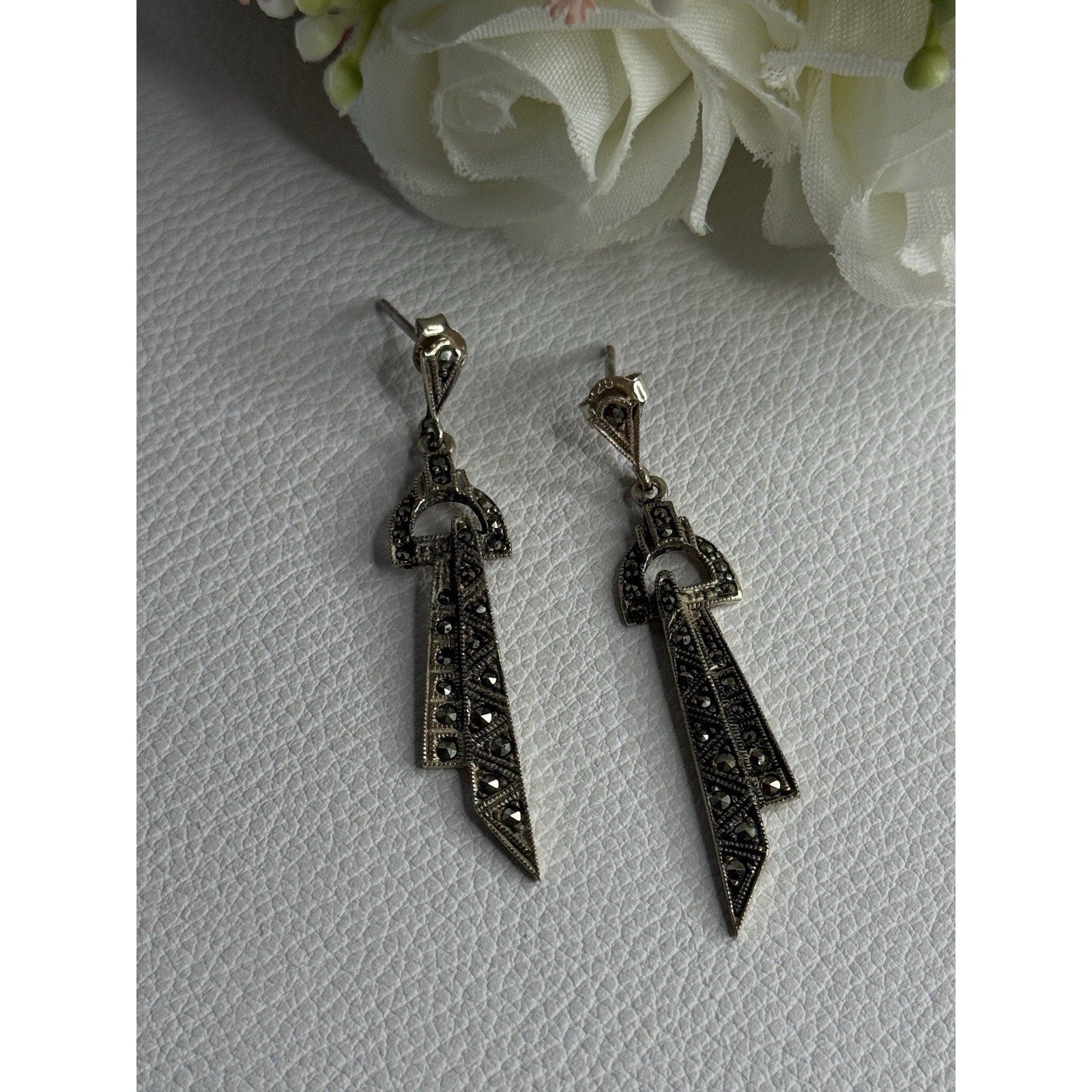 ELEGANT 925 STERLING SILVER MARCASITE EARRINGS LENGTH 1.80 INCH